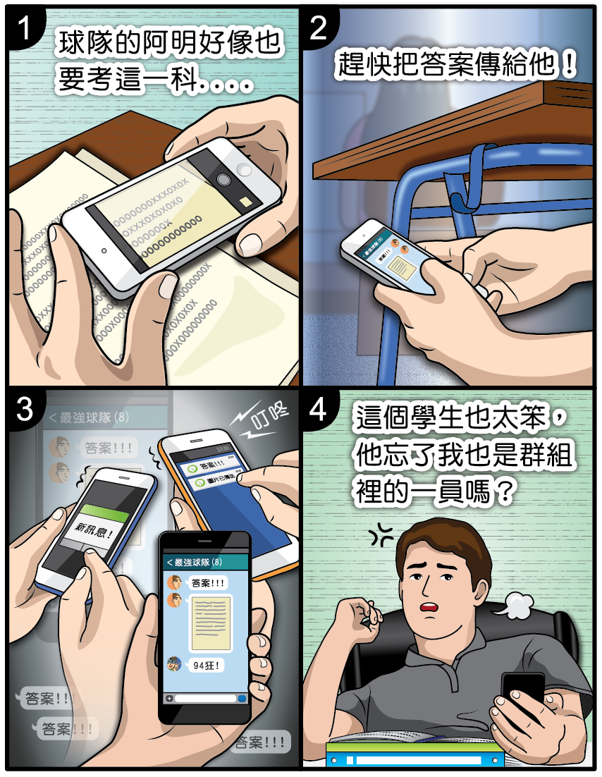 2015年6月,南部某科技大學一名學生於英文期末考時,因想罩球隊隊友,偷偷用手機拍下答案,LINE給隊友群組,卻忘了球隊的輔導老師也是群組一員,該老師氣得狠狠教訓他一番,並把對話上傳臉書,將其蠢事公開,做為對該學生的懲罰。(2017/4/6,引自2015/6/24,生活/南投報導,自由時報)